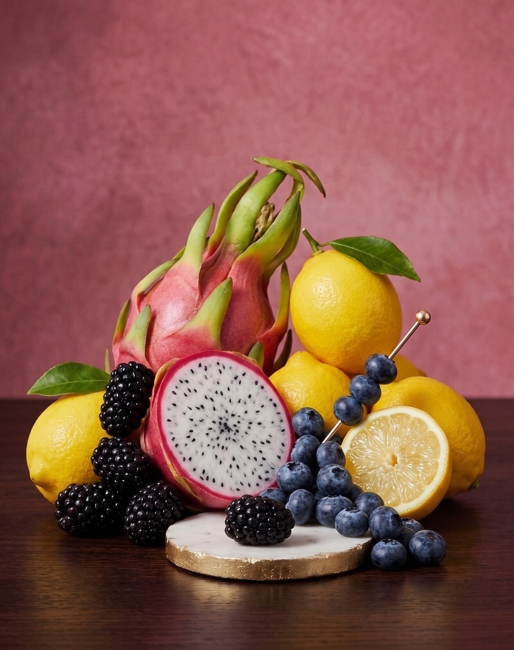 Verziert mit einem Spieß aus Beeren oder Drachenfrucht