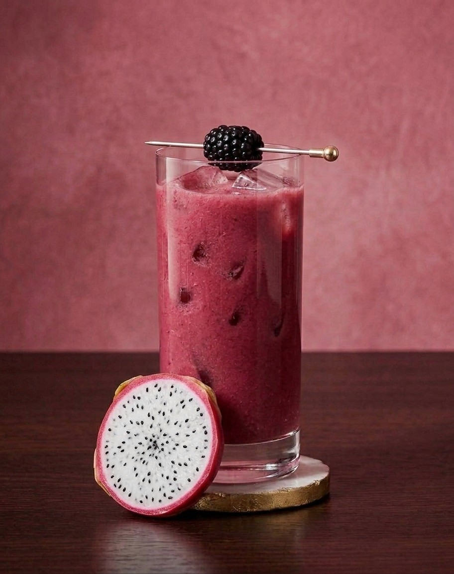 Für den Bromby Obstbrand, Drachenfruchtsaft, frischen Zitronensaft und Heidelbeer- oder Brombeersirup mit Eis shaken, in ein Glas abseihen und mit einem Spieß aus Beeren oder Drachenfrucht garnieren.